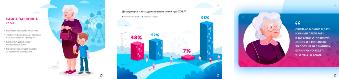 В eDetailing интегрированы слайды с игровыми механиками, показывающие как при применении правильной терапии можно помочь пациенту решить проблему и повысить качество жизни.