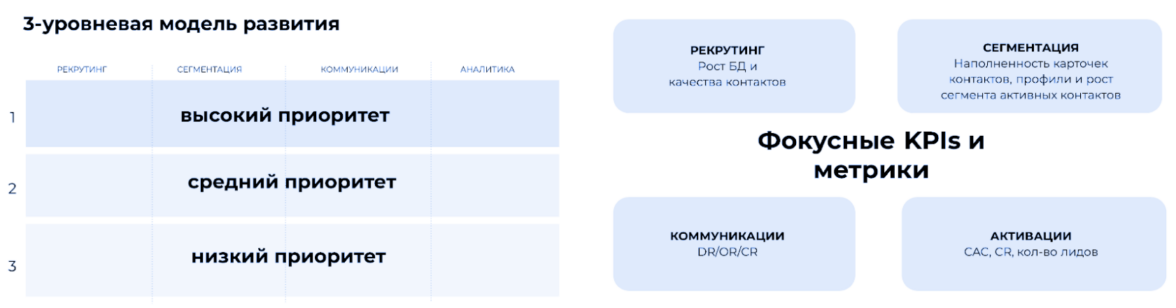 • этапы работы с CRM: рекрутинг, сегментацию, коммуникации, аналитику;