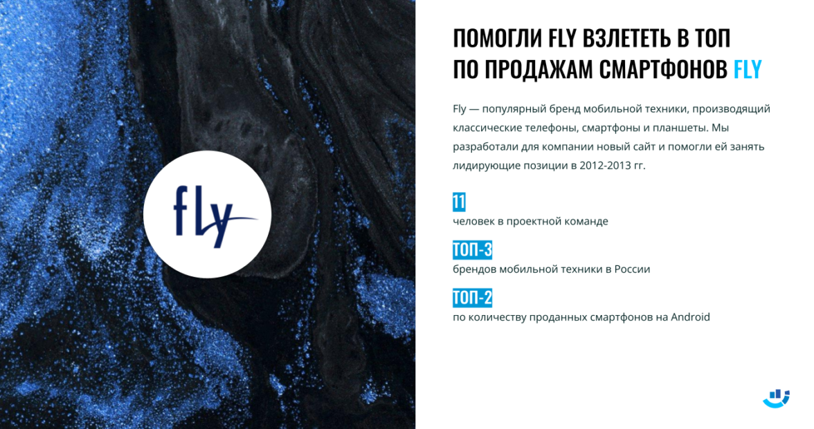 Бренд мобильной техники Fly производит классические телефоны, планшеты и смартфоны. Многие люди, в том числе и в нашей стране, пользовались кнопочными продуктами этой компании в начале 2000-х годов. Устройства были удобными, понятными и привлекательными в плане дизайна. Но чтобы занять лидирующие позиции в Сети, прошлых заслуг недостаточно. Именно поэтому к нам обратились за разработкой и продвижением сайта брендовой продукции.
