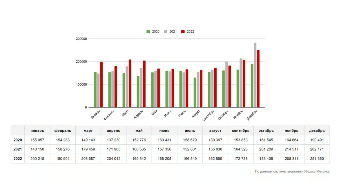 В результате нашего сотрудничества за год, удалось добиться заметного роста показателей. Динамика посещений соответствует сезонным колебаниям, а в 2022 году зафиксирован рост посещений с поисковых систем.