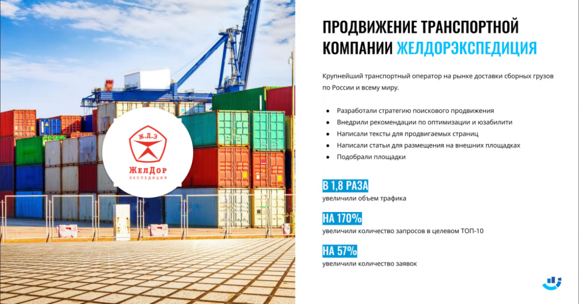 Кейс: Грузоперевозки. Увеличили показатели органического трафика и улучшили видимость сайта для крупной компании «ЖелДорЭкспедиция». Комплексное продвижение
