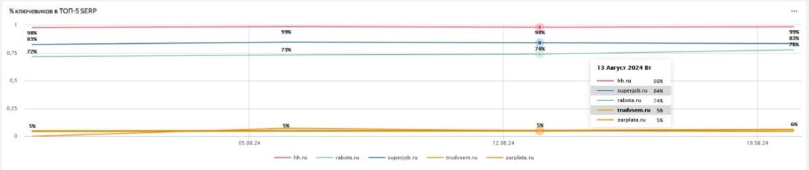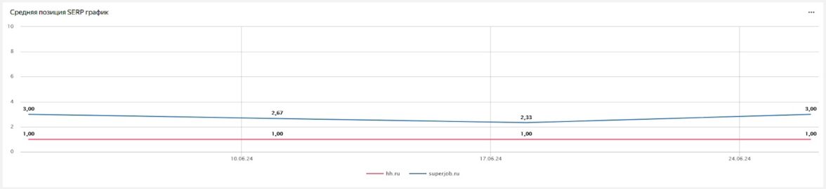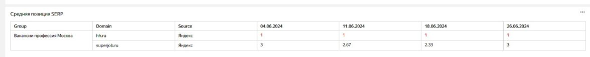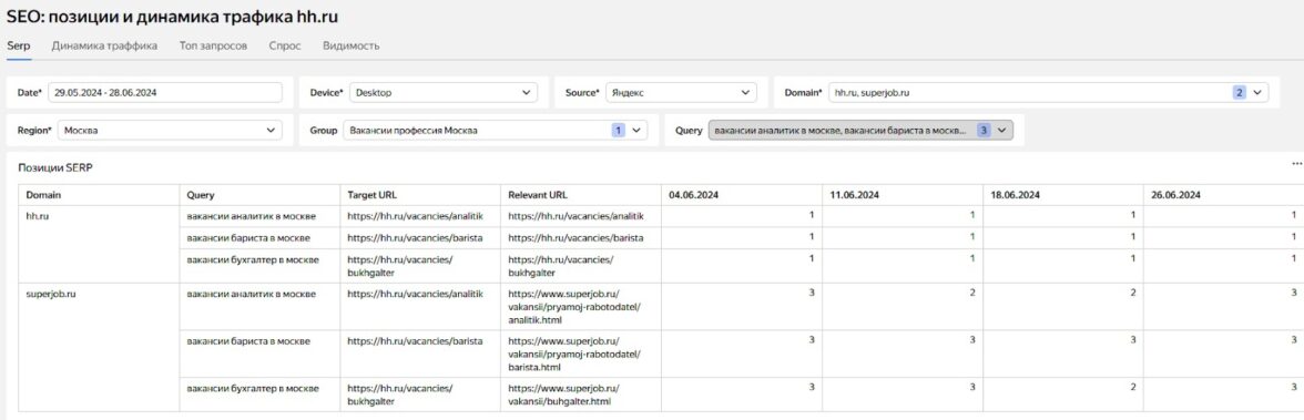 «Serp» — здесь видим сравнение позиций hh.ru с позициями конкурентов по определенным запросам.