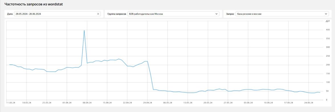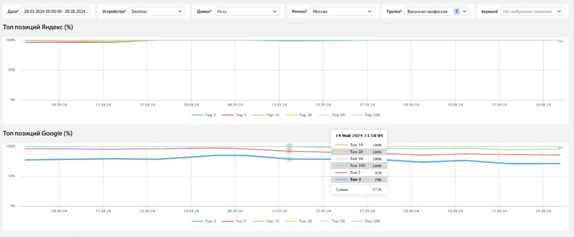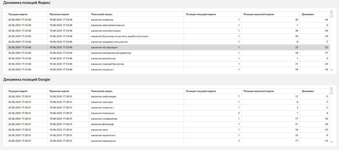 Здесь же — динамика позиций по запросам за конкретный период. Например, выбираем поисковый запрос по вакансии и смотрим, что с ним происходит в течение недели: упал он или поднялся в поиске Яндекса и Google: