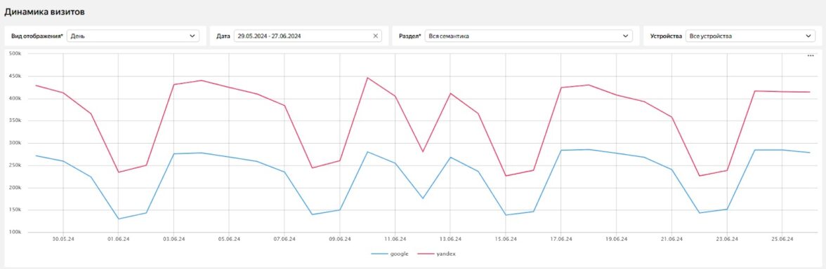 Здесь отображается динамика визитов по Яндексу и Google за определенный период без сравнения с конкурентами. Тут анализируем, в какой период, с каких устройств сколько человек заходят на разные разделы — вакансии, компании, резюме, статьи.