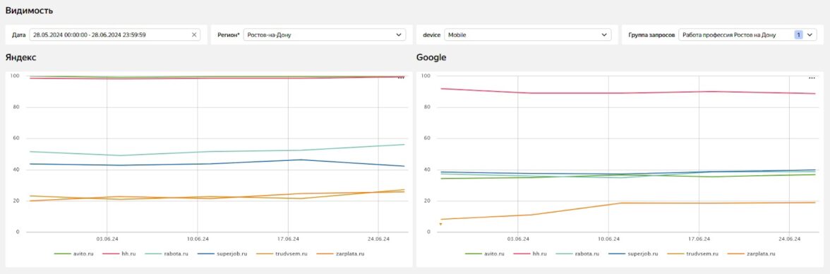 На графиках по Яндексу и Google можно посмотреть видимость в поисковиках сайтов-конкурентов по каким-либо запросам. Например, выбираем регион Ростов-на-Дону, группу запросов, которая относится к этому региону, мобильные устройства и получаем следующую картину: