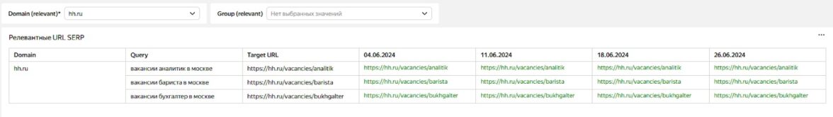 А еще Serp поможет узнать релевантные URL запросов. Зеленый цвет подсказывает, что страница релевантна текущему запросу в конкретную дату.