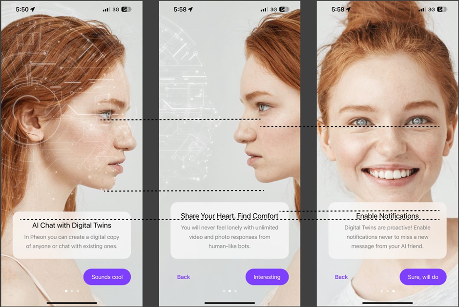 В приложении Pheon человек может найти виртуального друга или создать цифровую копию реального человека, например загрузить фотографию бывшей девушки и пообщаться с ней. Бот умеет писать текст, записывать видео, а еще его легко кастомизировать — наделить уникальными чертами характера и научить отвечать.
