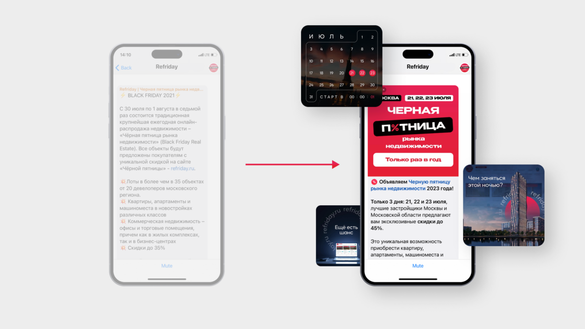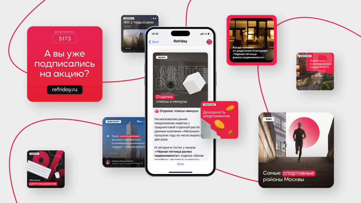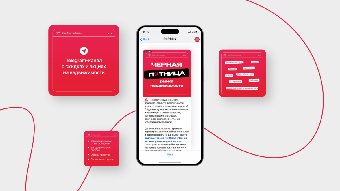 Перезагрузка Telegram-канала акции. Официальный Telegram-канал «Refriday | Чёрная пятница рынка недвижимости» стал ещё одной полноценной контентной площадкой, с помощью которой мы выстраивали качественную связь с аудиторией. Канал выступал основным источником информации об акции и промежуточным звеном между намерением пользователя и принятием решения о покупке.