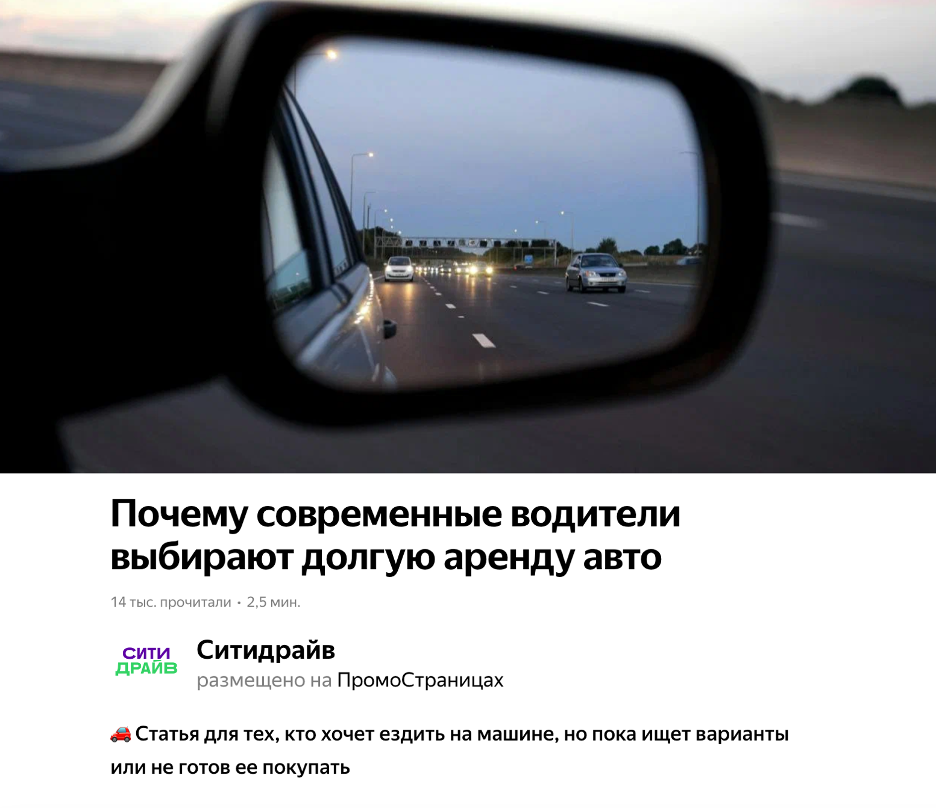 Заход: в статье сравнили покупку и аренду автомобиля, объяснили, почему аренда выгоднее. Также рассказали, чем «Ситидрайв» лучше других вариантов.