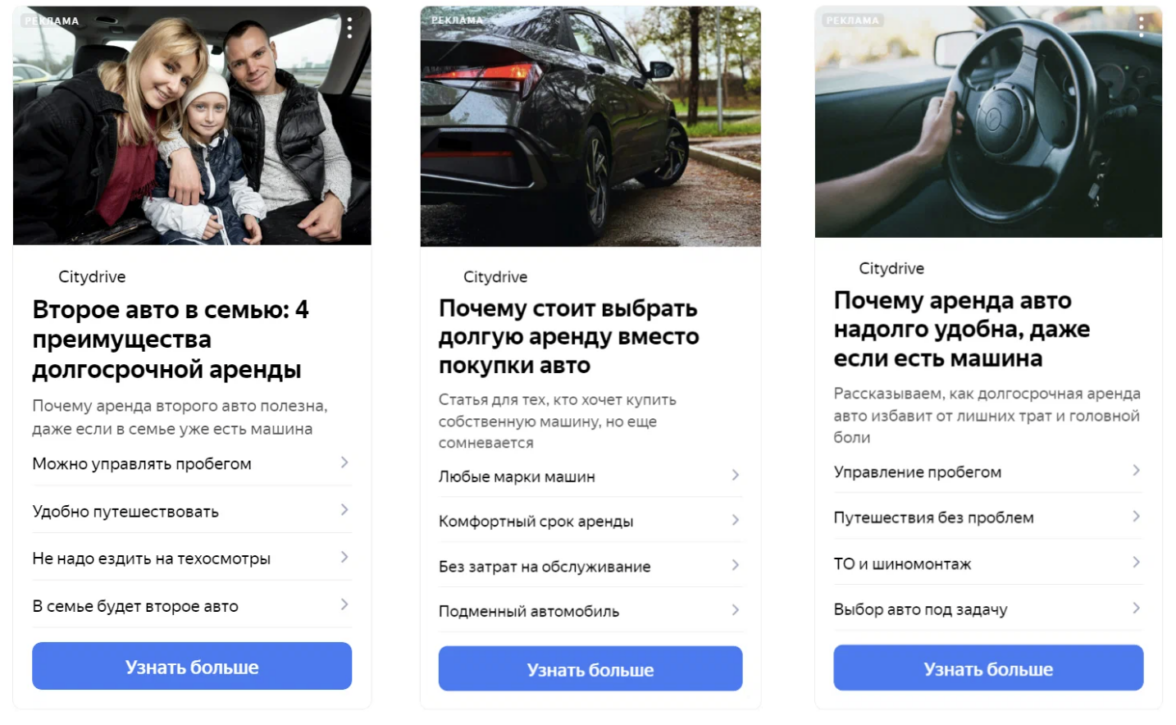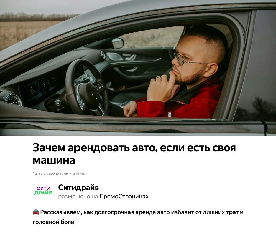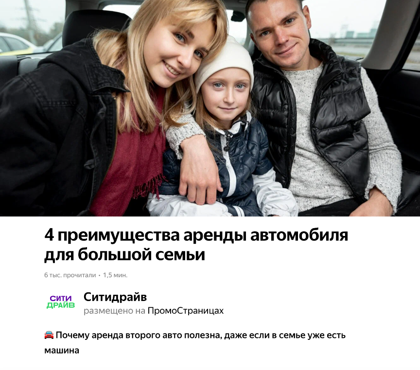 Команда выбрала пакет размещения Plus, где созданием контента занимались специалисты ПромоСтраниц при участии клиента в доработке ключевых моментов. Создали три статьи, каждая из которых была нацелена на определенную аудиторию. В материалах прописана основная боль каждой ЦА и преимущества подписки от «Ситидрайва».