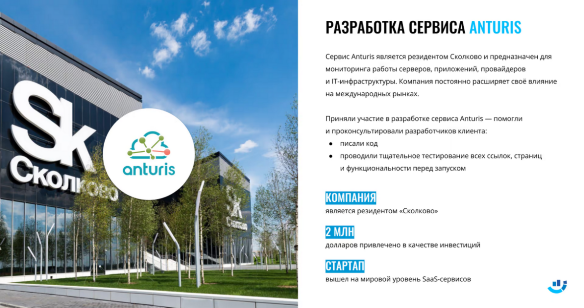 Anturis, резидент Сколково, предоставляет услуги мониторинга серверов, приложений, провайдеров и IT-инфраструктуры, активно расширяя свои позиции на глобальном рынке.