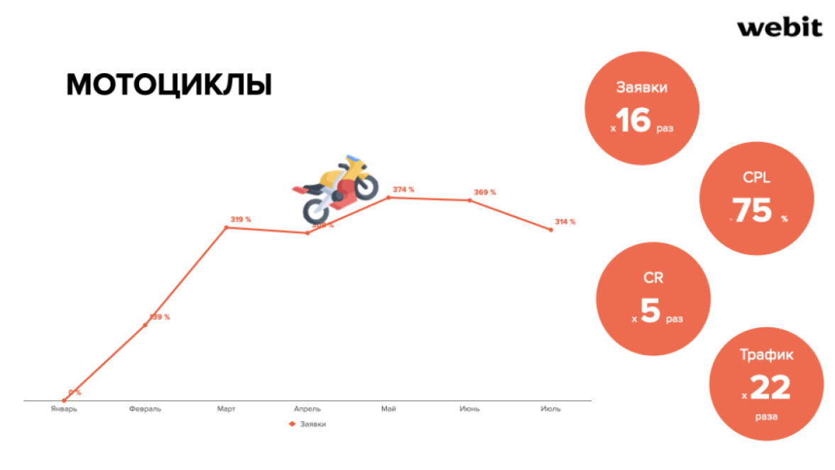Весной, через полгода после старта обновленной digital-стратегии, ориентированной на китайский автопром, «Япония Трейд» расширила ассортимент — в него были добавлены как японские мотоциклы (Kawasaki), так и BMW, Ducati, которым удалось адаптировать продажи к внешним ограничениям. Появление нового востребованного весной товара помогло компании нарастить экономическую эффективность рекламы.