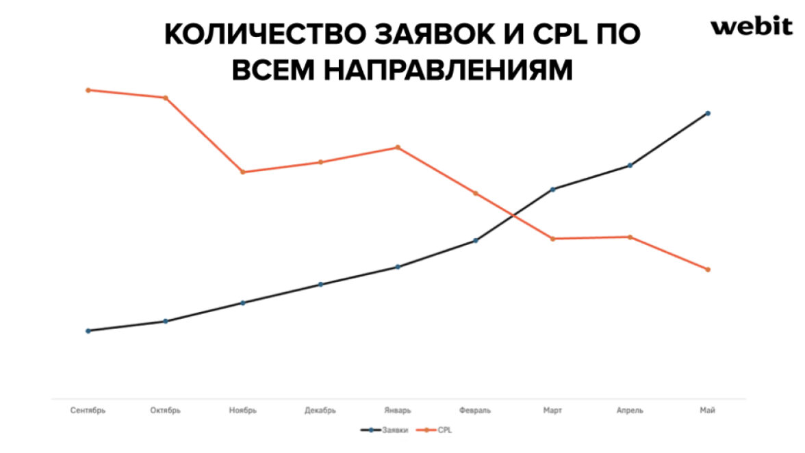 Ключевым KPI для агентства являлась стоимость лида (CPL). Поэтому приходилось искать оптимальные модели оплаты рекламных показов, которые позволяли бы выдерживать необходимые финансовые показатели. ГК Webit использовала стратегии «максимум конверсий» с различными моделями оплаты. Работали как «оплата за конверсии», так и «оплата за клики». Однако для снижения исходного CPL помог именно перевод основных кампаний на «оплату за клики».
