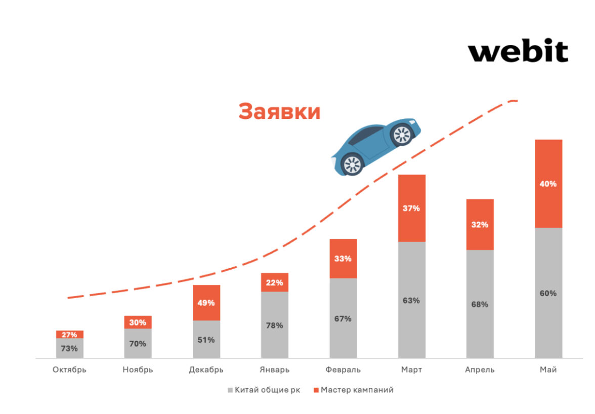 Почти треть всех заявок по китайским авто (35%) пришли именно с «Мастер кампаний». При этом CPL в них ниже, чем в основных типах кампаний по китайским авто на − 27%.