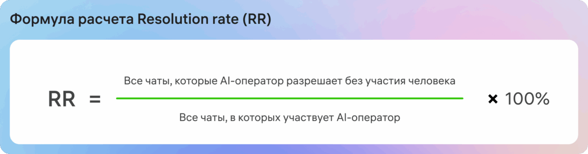 Метрика resolution rate обычно применяется для оценки эффективности работы саппорта. Мы используем ее, чтобы отследить процент диалогов, которые AI-оператор закрывает самостоятельно. Ориентируясь на данную метрику, можно определить, в каком количестве случаев для решения вопроса пользователя было достаточно общения исключительно с нейросетью.