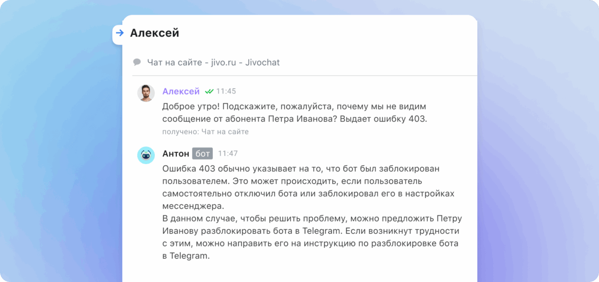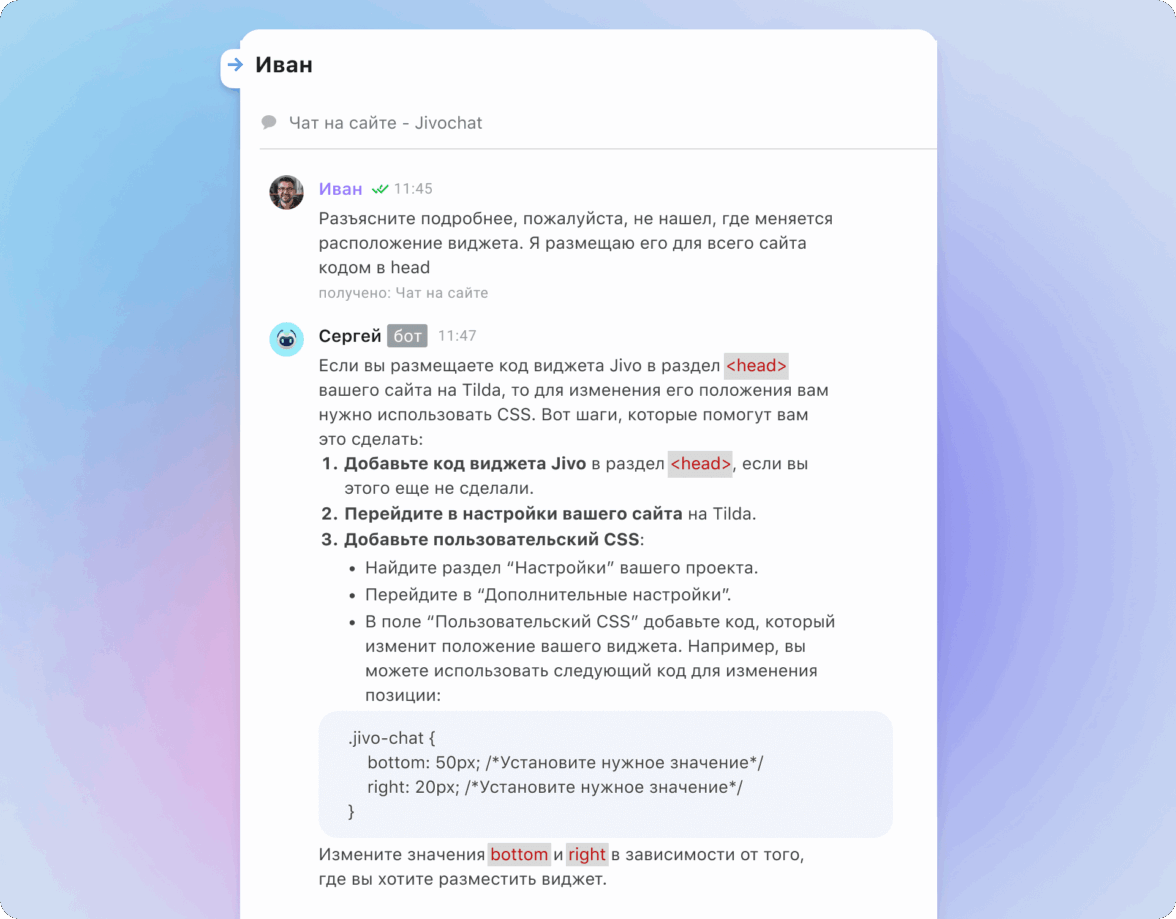 Благодаря этой функции клиентам стало проще настроить и установить продукты Jivo на свой сайт. И этот процесс стал занимать меньше времени. Ранее в такой же ситуации оператор ходил искать нужный файл в базе знаний, а клиент ждал ответ до 5 минут. Сейчас AI-оператор справляется с подобными запросами в среднем за 30 секунд.