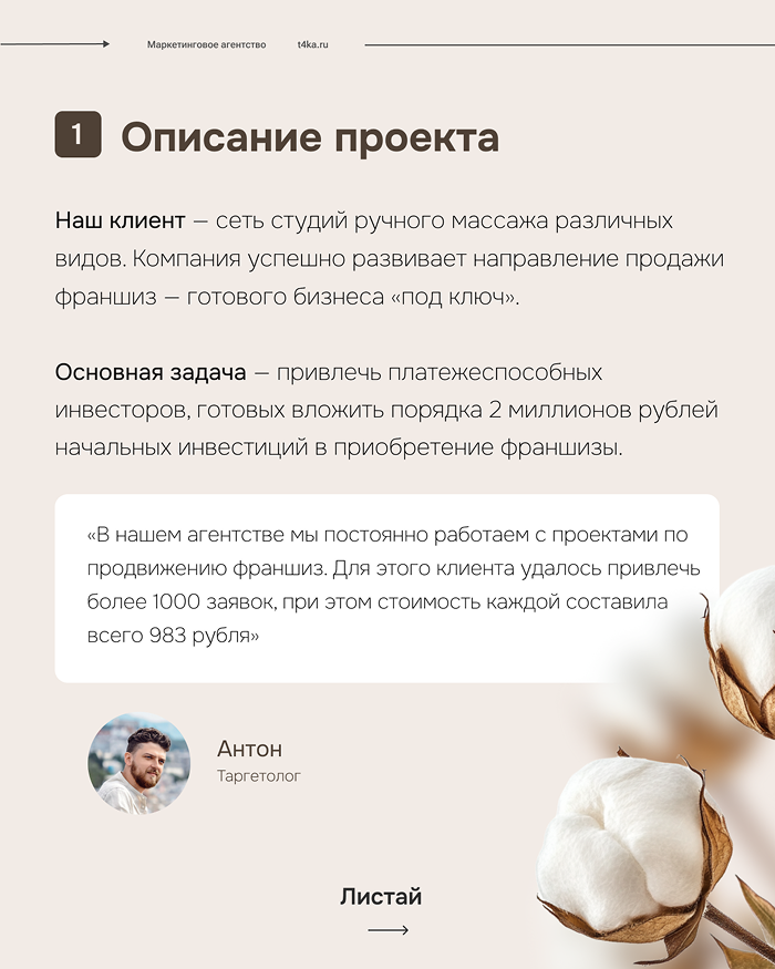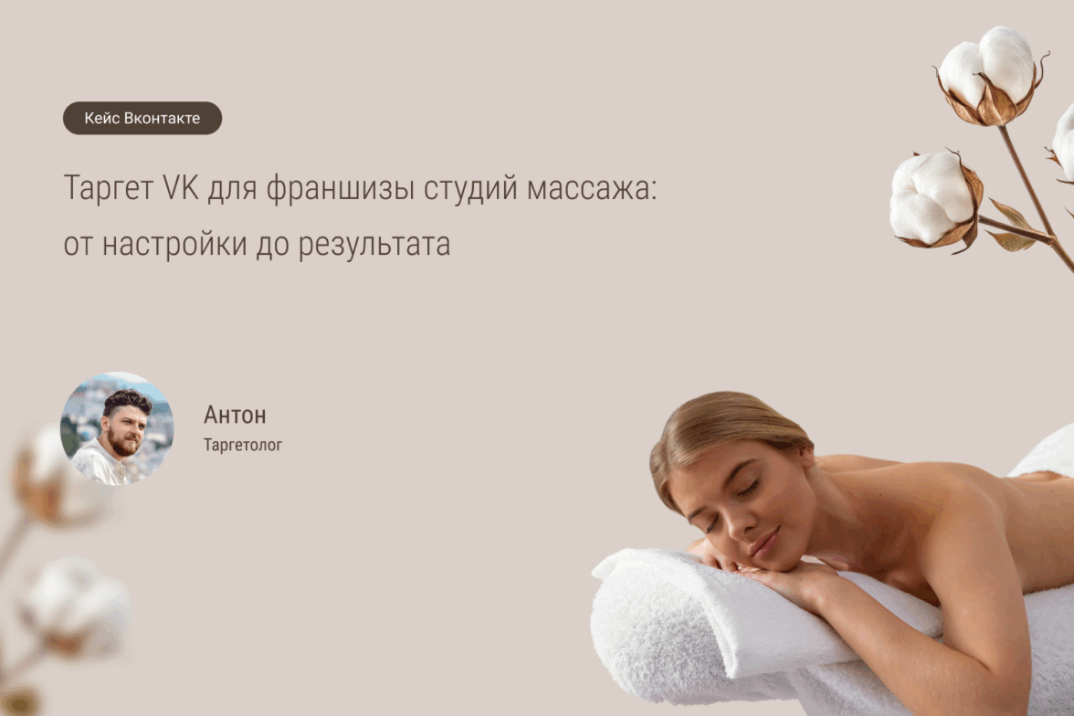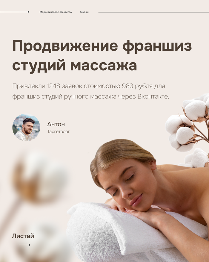 Привет! Меня зовут Антон, я таргетолог. В нашем агентстве мы постоянно работаем с проектами по продвижению франшиз. Для этого клиента, продвигающего франшизу студий ручного массажа, через ВКонтакте удалось привлечь более 1000 заявок, при этом стоимость каждой составила всего 983 рубля