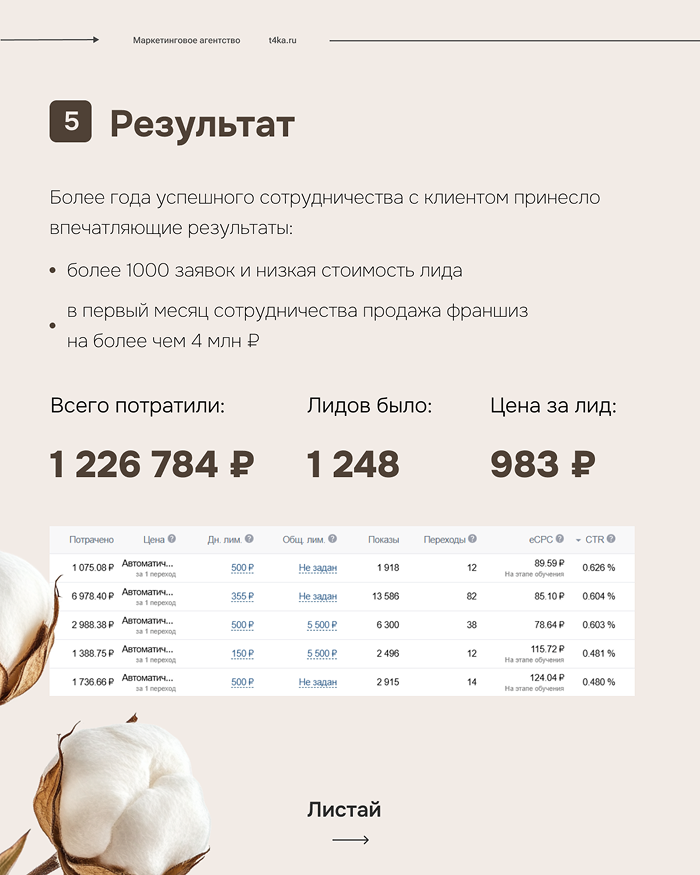 Более года успешного сотрудничества с клиентом принесло впечатляющие результаты: продажа франшизы за 2 миллиона рублей уже в первый месяц, вторая сделка на стадии подписания, более 1000 заявок и низкая стоимость лида (983 рубля). Продолжаем работать и достигать новых высот!