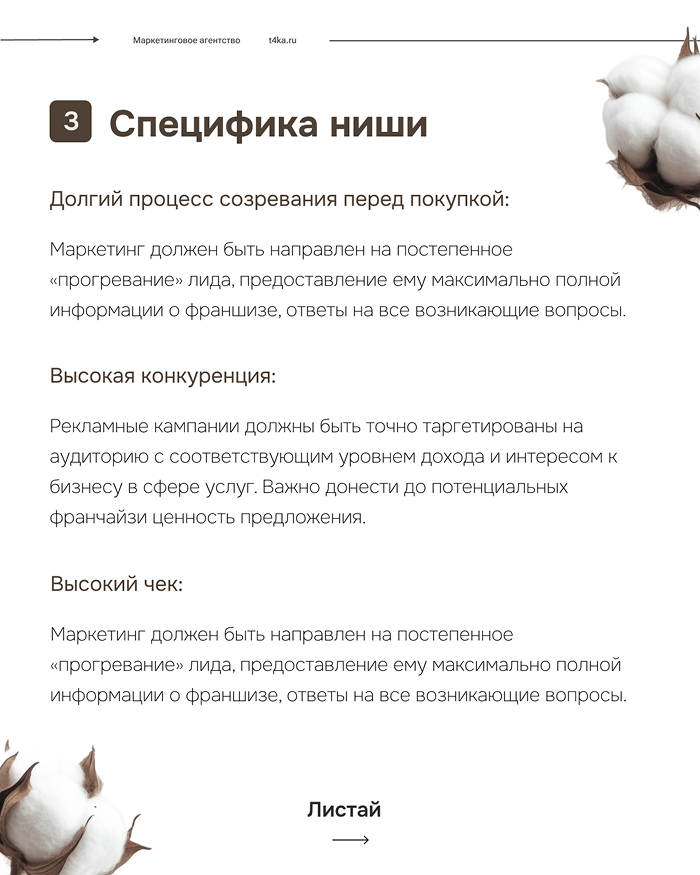 Решение о покупке франшизы студии массажа — это серьезный шаг, требующий тщательного обдумывания. Маркетинг должен быть направлен на постепенное «прогревание» лида, предоставление ему максимально полной информации о франшизе, ответы на все возникающие вопросы и сопровождение на всех этапах принятия решения.
