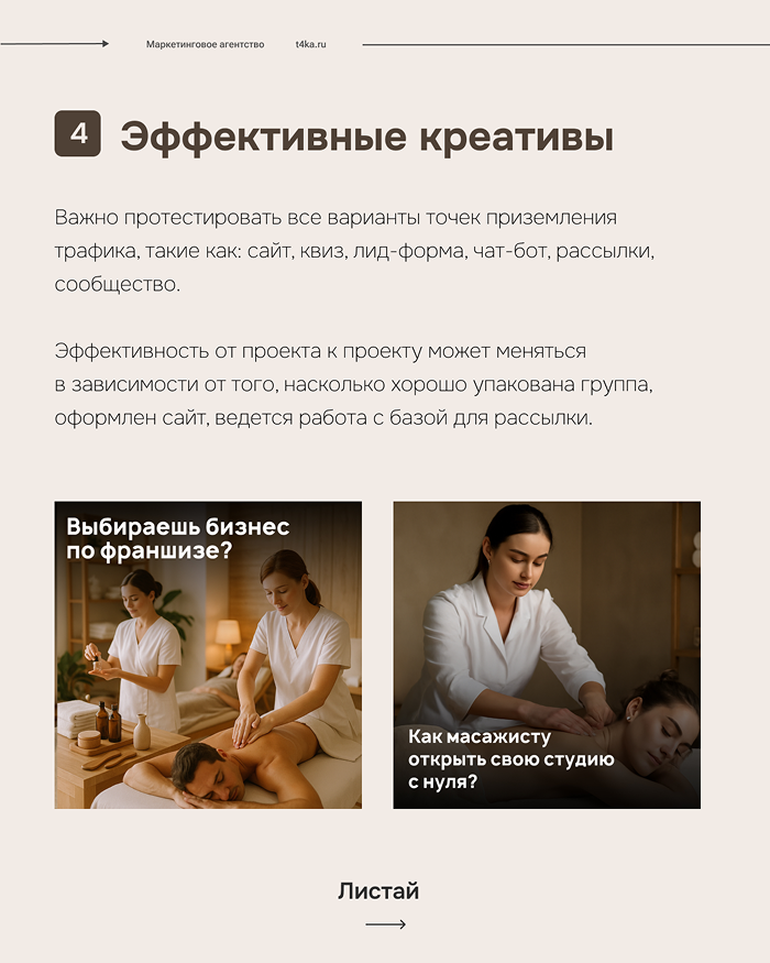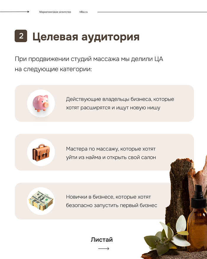 Для эффективной рекламы важно точно понимать, кто ваша целевая аудитория. Чтобы найти предпринимателей, заинтересованных в покупке франшизы массажной студии, мы используем следующую стратегию: