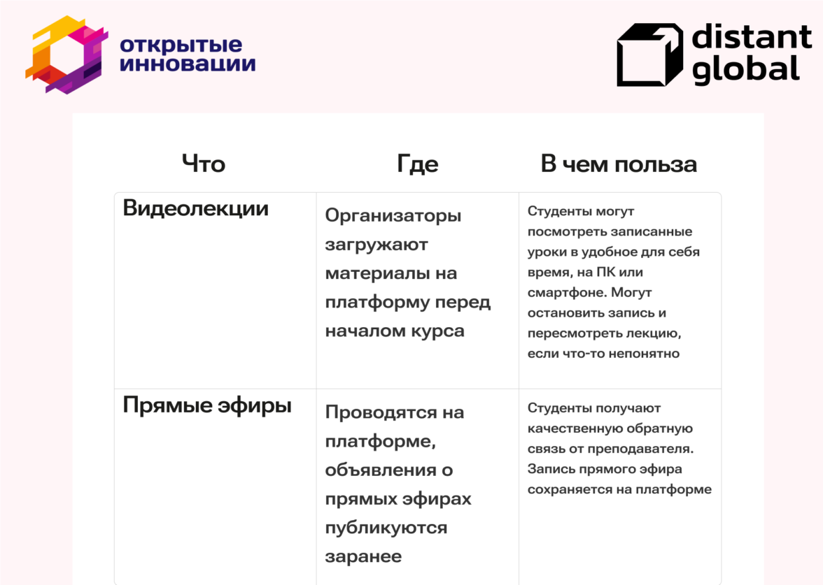Сочетание онлайн и офлайн-уроков на платформе помогает методологам добиться ощутимых результатов в обучении. При внимательном просмотре видеолекций и регулярном посещении прямых эфиров и очных практик, студенты глубже погружаются в процесс создания стартап-проектов. В целом использование цифровых платформ на 25% повышает вовлеченность слушателей в обучение, согласно данным зарубежных исследователей.