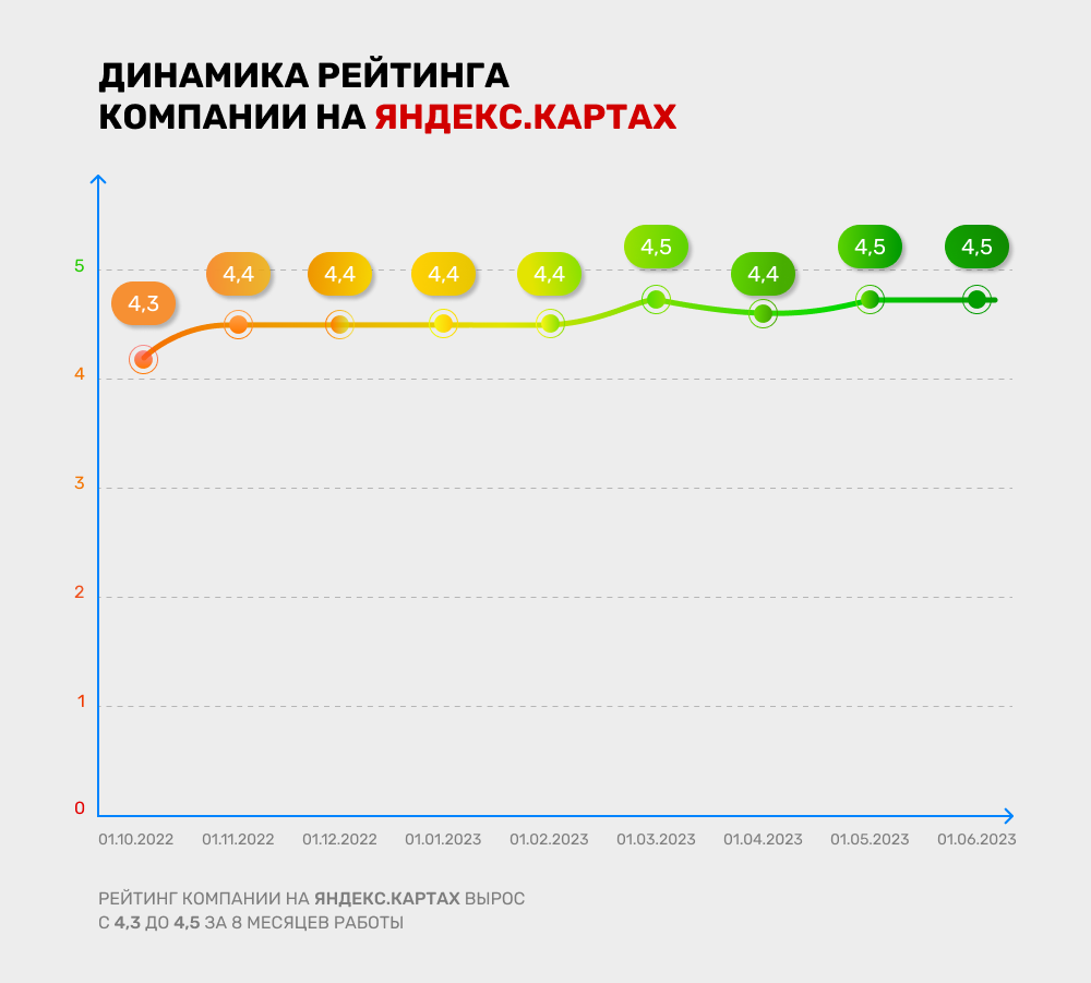 Корректировка рейтинга. За 7 месяцев, с учетом регулярного появления новых негативов, рейтинг на Яндекс.Карты был не только удержан на прежнем уровне, но и поднят на 0,2.