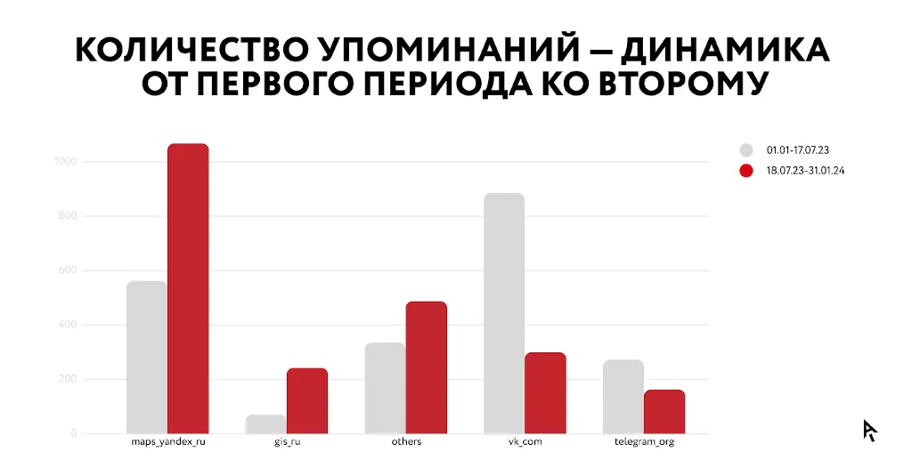 Мы проанализировали динамику тональности упоминаний — сравнение двух периодов (январь-июль 2023 и июль 2023-январь 2024) показало, что работы по улучшению репутации бренда помогли увеличить количество позитивных публикаций, снизить долю нейтрального и негативного контента. Мы также выяснили, что количество упоминаний напрямую влияет на положительную активность аудитории — пользователи создают дискуссии и тематические линии, в которых рекомендуют бренд в целом и конкретные точки продаж.
