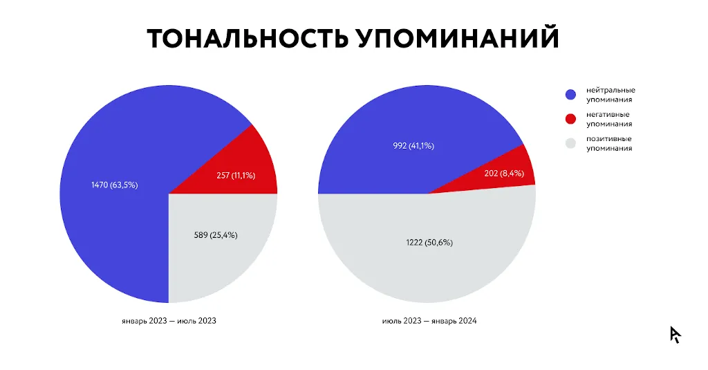 В первую очередь мы оценили результаты ORM-работ и проанализировали динамику репутационного фона — сравнили период с января по июль 2023 года и период с июля 2023 по январь 2024 года.