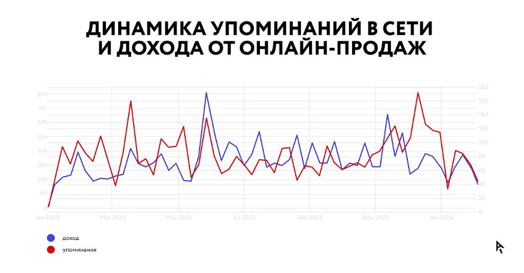 Анализ позволил установить — работы по ORM действительно влияют на продажи. На графике ниже видно, что показатели дохода от онлайн-продаж и количества упоминаний компании в сети имеют взаимосвязь: пики по росту и падению значений близки или совпадают по времени.