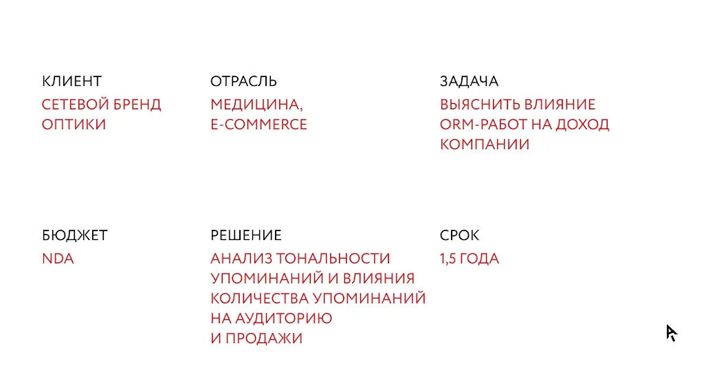 В течение 1,5 лет мы вели работы по улучшению позиционирования в медиапространстве сети салонов оптики и достигли хороших результатов. Однако оценить влияние ORM на ключевой показатель бизнеса — прибыль — в рамках проекта было невозможно. Совместными усилиями специалистов отдела аналитики и департамента рекламы в социальных медиа и управления репутацией «Ашманов и партнеры» был проведен анализ кейса, чтобы выяснить, как работы по управлению репутацией помогают повышать продажи. Рассказываем подробнее, что и как делали.
