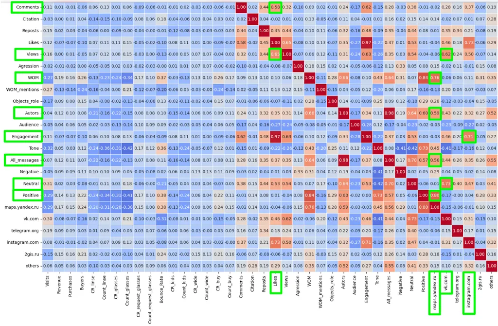 Левая часть тепловой карты показывает пересечения строк с данными Brand Analytics и столбцов с данными Яндекс.Метрики, она холодная по цвету — связь между этими переменными или очень слабая, или неочевидная.