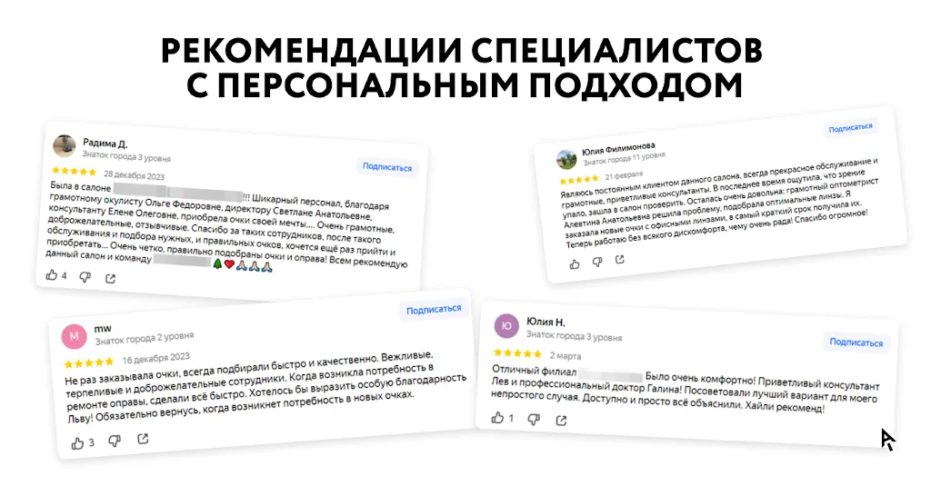Аудитория доверяет мнению других покупателей и ориентируются на их рекомендации, особенно если они касаются специалистов с персональным подходом. Большое количество позитивных рекомендательных отзывов мотивируют пользователей посетить салон.