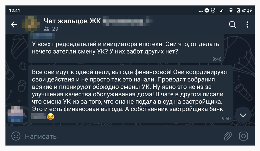 В личных сообщениях нашего агента влияния пригласили в закрытый чат, который не контролировался советом дома, лоббирующим новую УК.