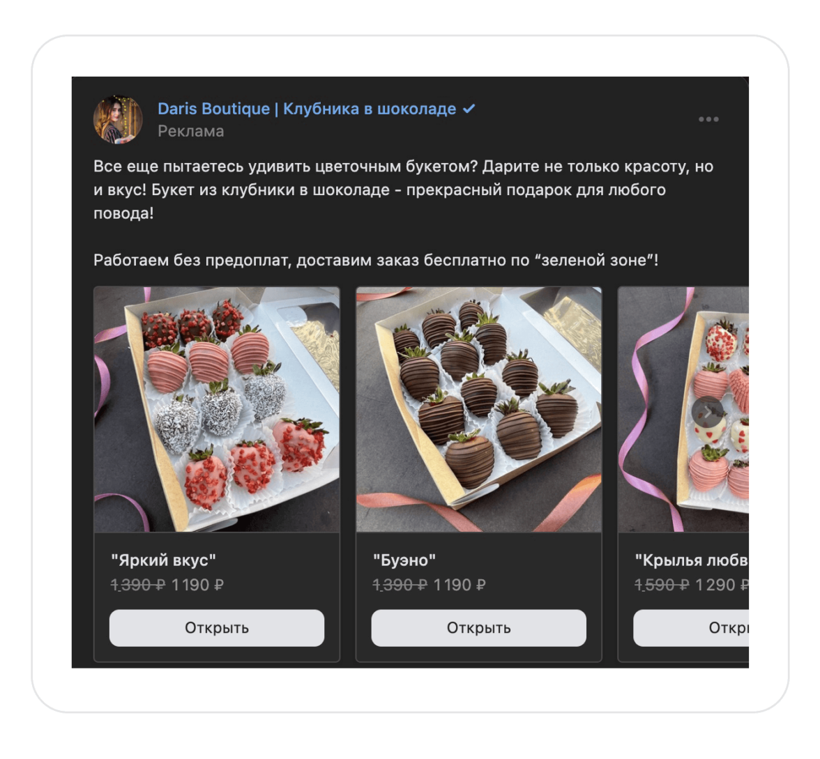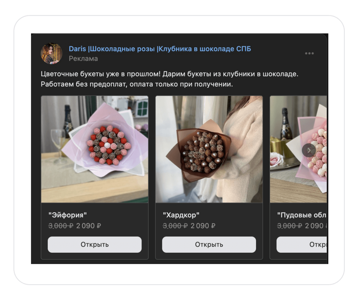 Для этих аудиторий больше подходит формат «Карусель». Человек обращает внимание на нестандартные букеты и хочет посмотреть другие товары.