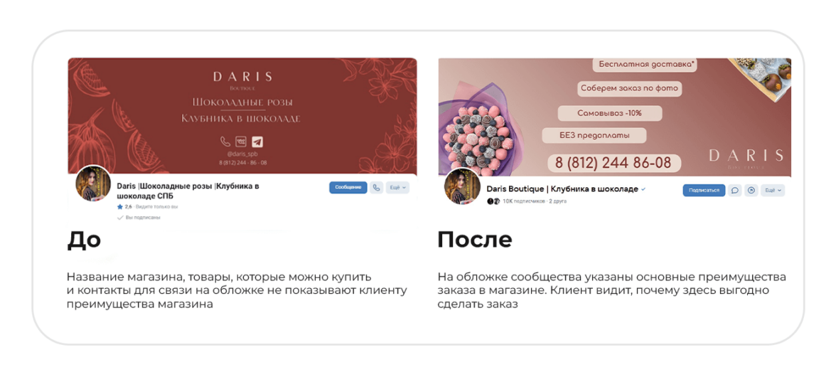 Обложка. Указать на обложке сообщества основные офферы, что поможет клиенту сразу увидеть главные преимущества магазина.