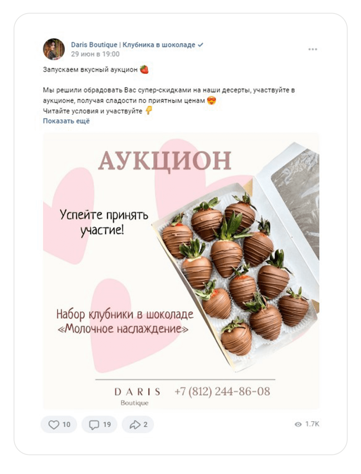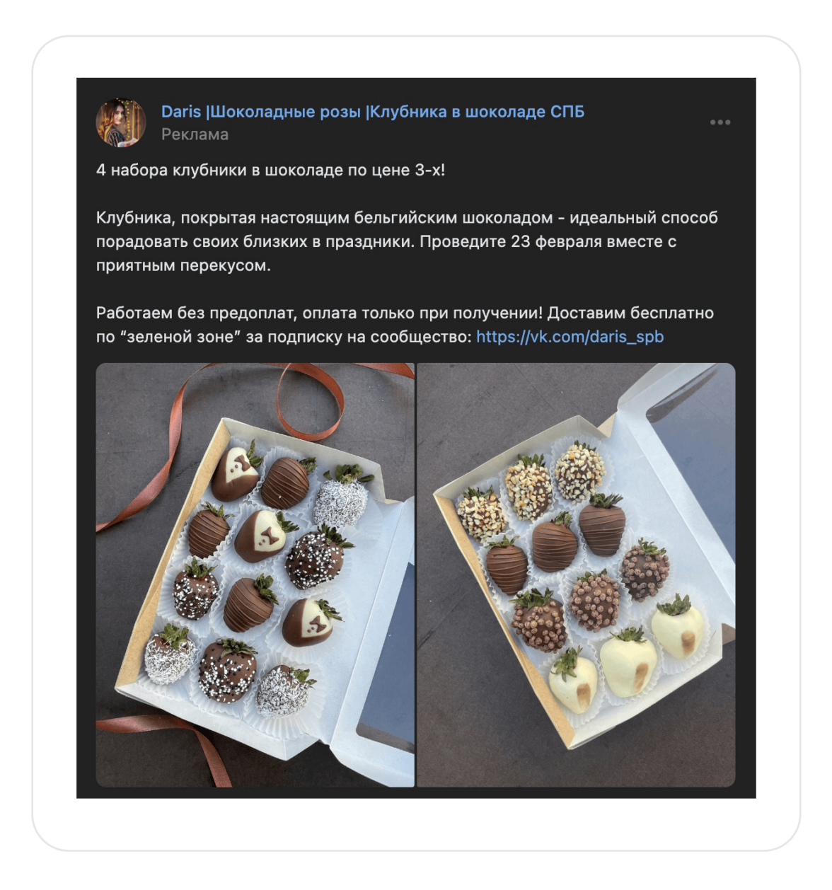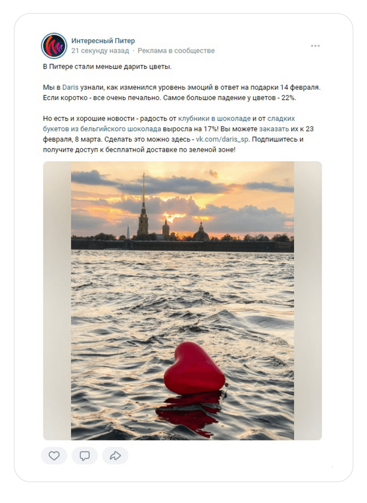 Адаптация объявлений помогает вызвать больше доверия у подписчиков. Например, в сообществе, где публикуются новости Питера, подали информацию, как актуальное событие города. А не просто рассказали, о возможности порадовать себя и своих близких букетом из шоколадных роз. Формат объявления соответствовал публикациям паблика, и некоторые люди даже не заметили, что это реклама.