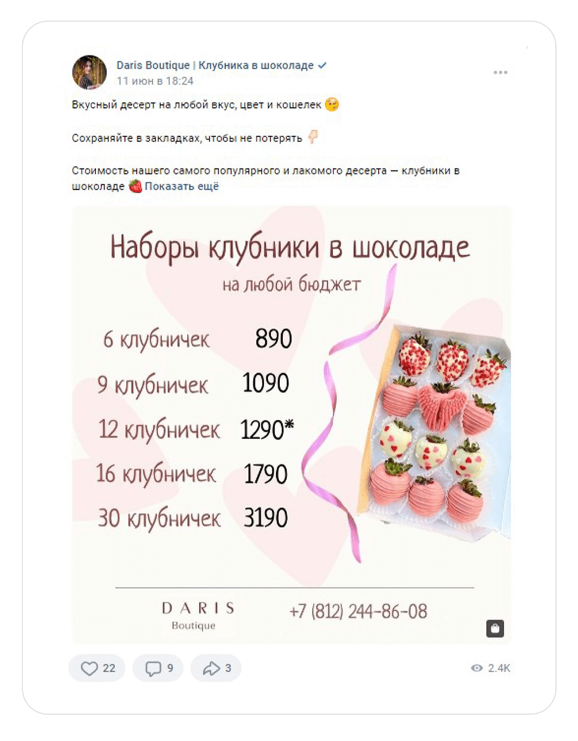 Количество шоколадных клубничек в букете или коробке поможет клиенту быстрее сориентироваться с размером подарка