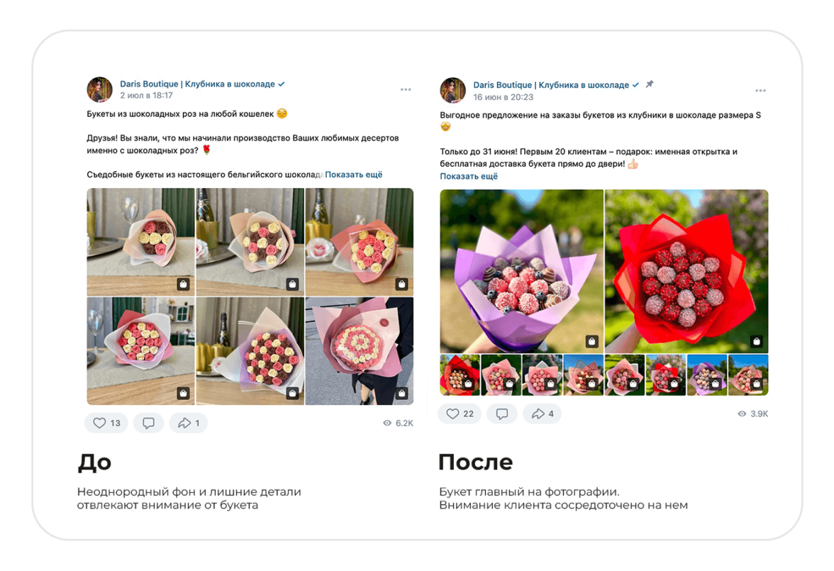 — начнем выкладывать больше видео и клипов с букетами в сообщество, что позволит клиентам быстрее понять, как композиция выглядит вживую