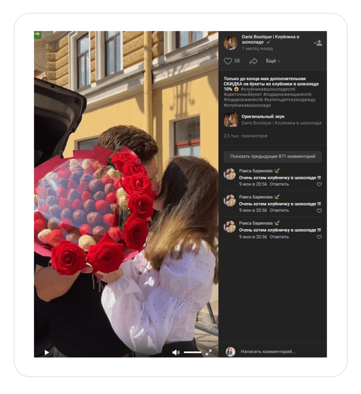 Салют! С вами Александр Верга и агентство the Verga. Работали с магазином Дариш, который продает шоколадные розы и клубнику в шоколаде в Санкт-Петербурге.