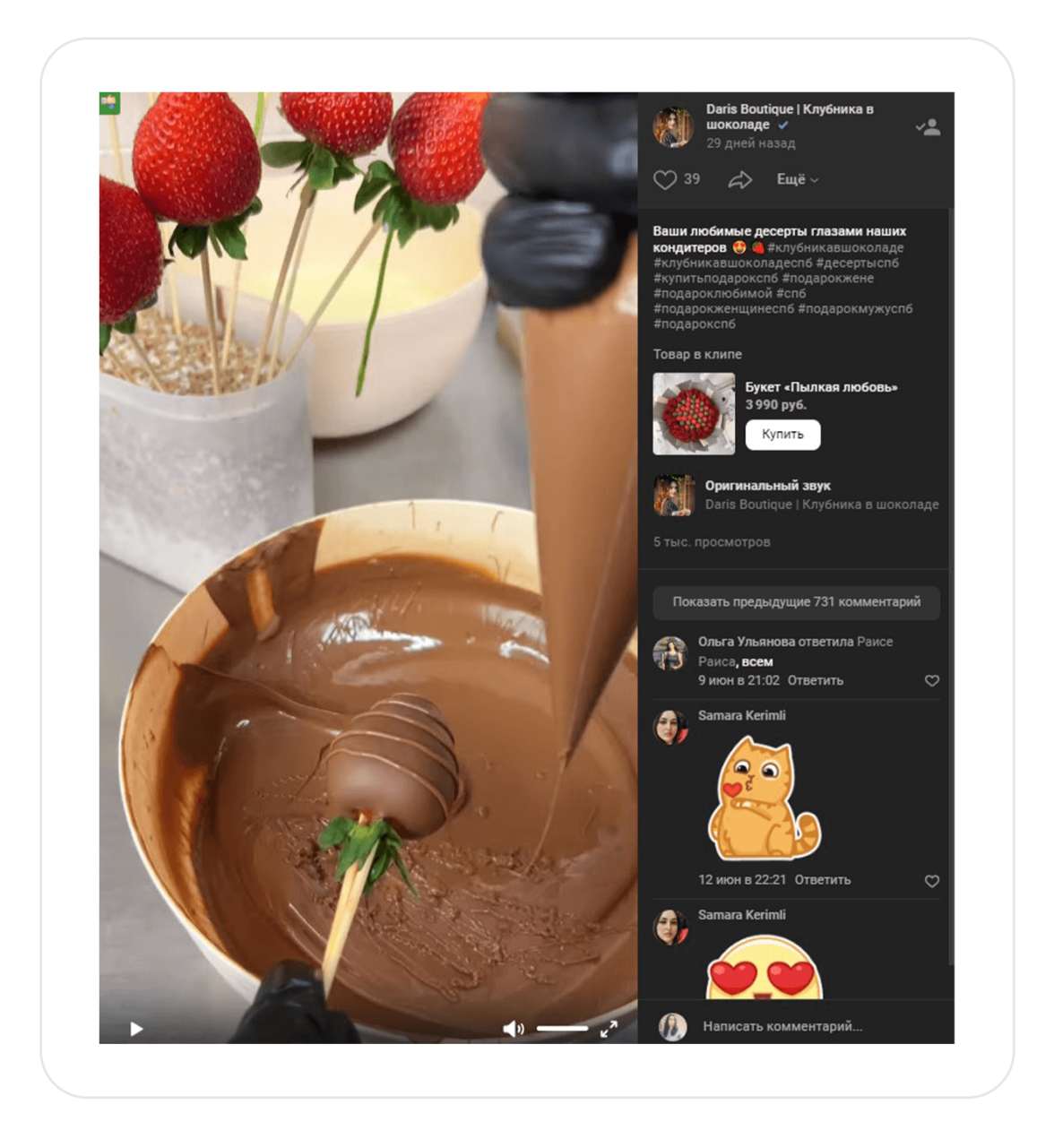 В клипе виден процесс создания букета из клубники в шоколаде