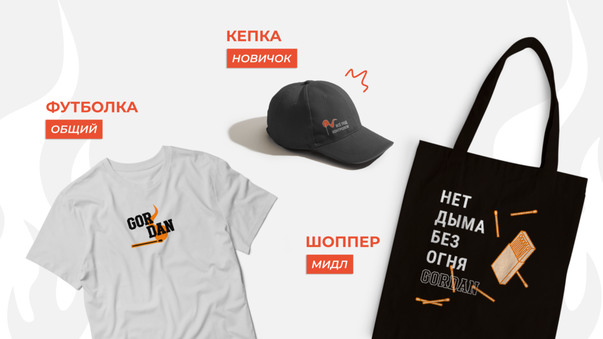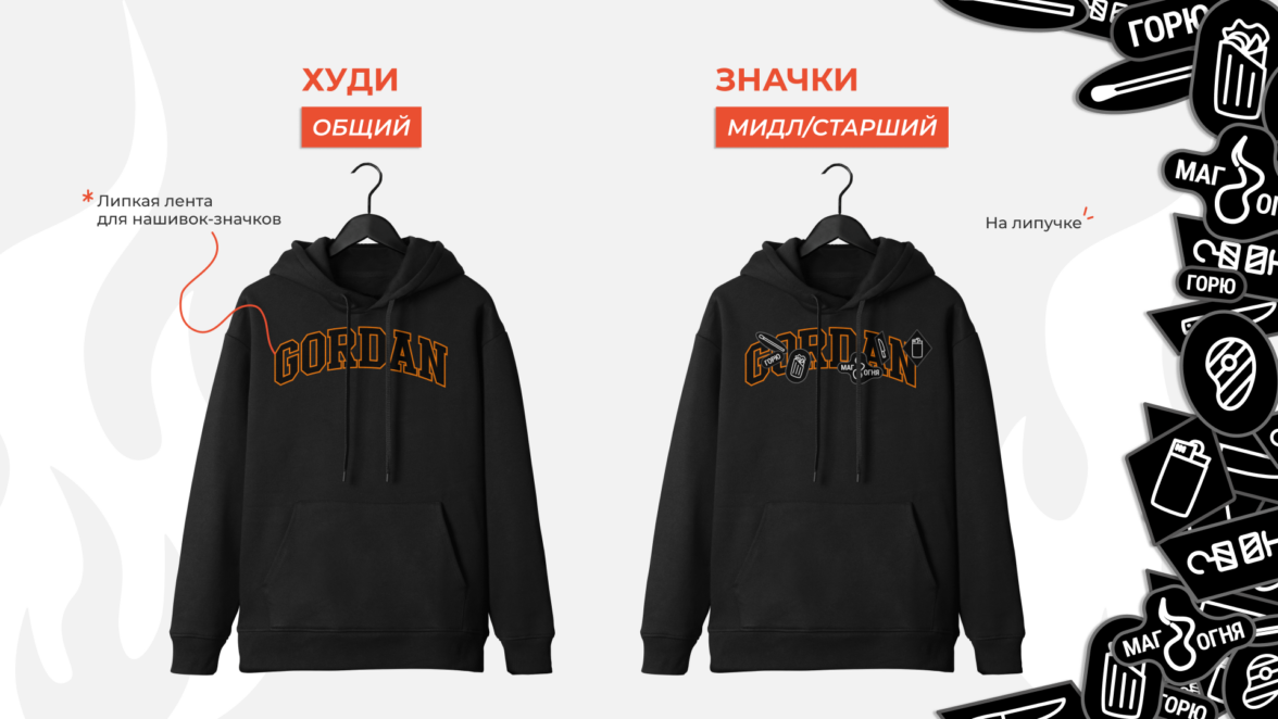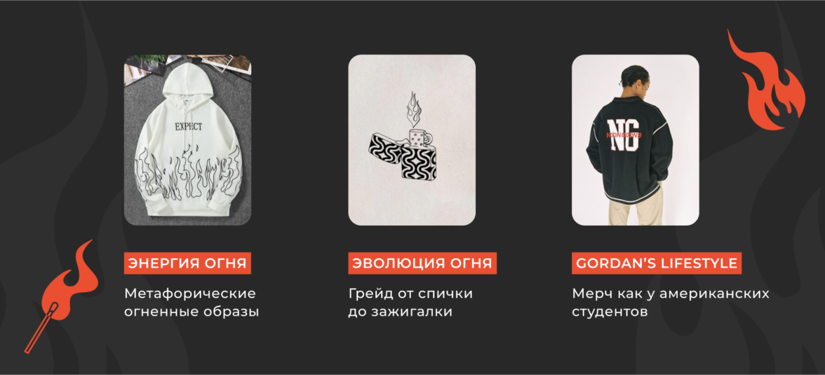 Gordan’s Lifestyle. Убираем огонь, его уже много! Мерч не обязательно должен цитировать работу. Отображаем ценности через «американский студенческий мерч»: тоже учимся, тоже растём, тоже любим проводить время друг с другом. И ценим это.