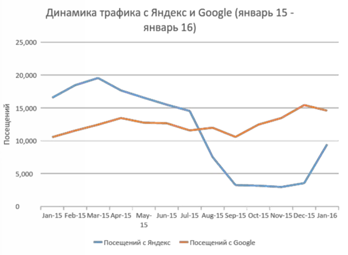 4. Общение с яндексом. Поддержание связи с яндексом демонстрировало нашу приверженность снятию ограничений. Стратегически разработанный и реализованный план позволил нам сократить срок снятия ограничений до двух с половиной месяцев, и уже в январе 2016 года трафик начал резко расти.