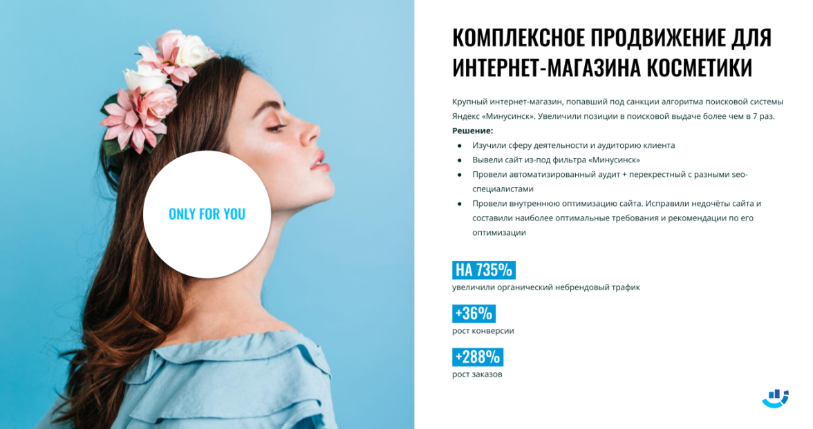 Косметика. Победили Яндекс «Минусинск» и подняли конверсию и трафик на сайт. Продвижение интернет-магазина косметики Only for you