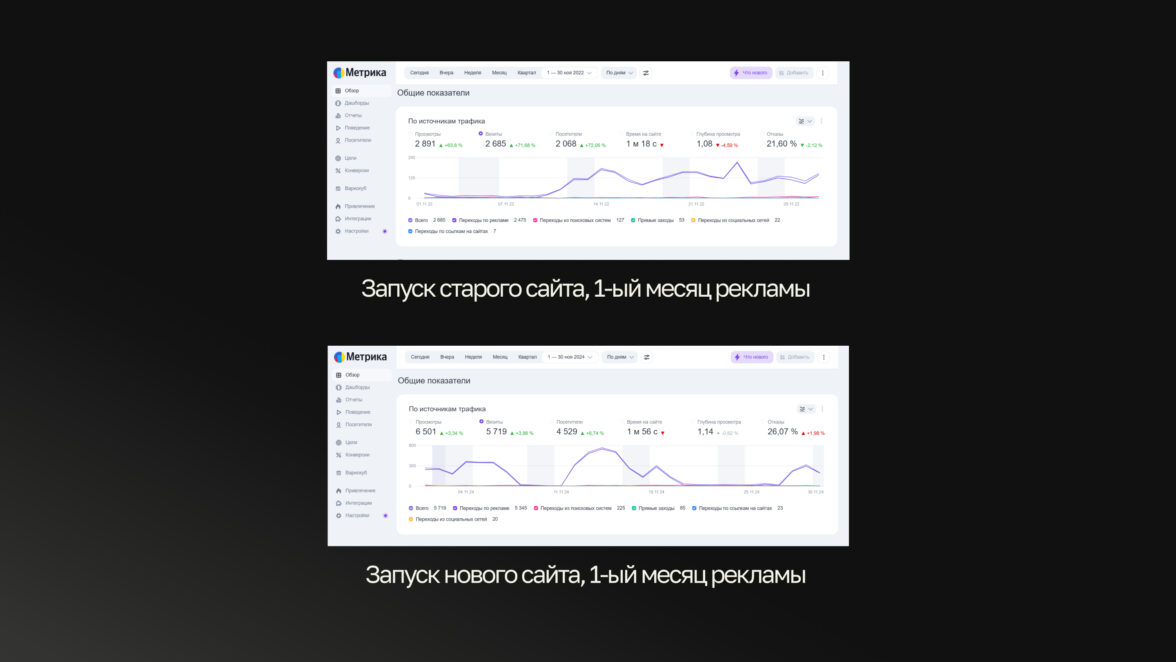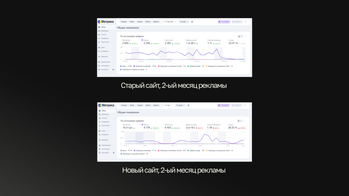 Второй месяц запуска рекламы на старый сайт в 2022 году и на новый сайт в 2025 году