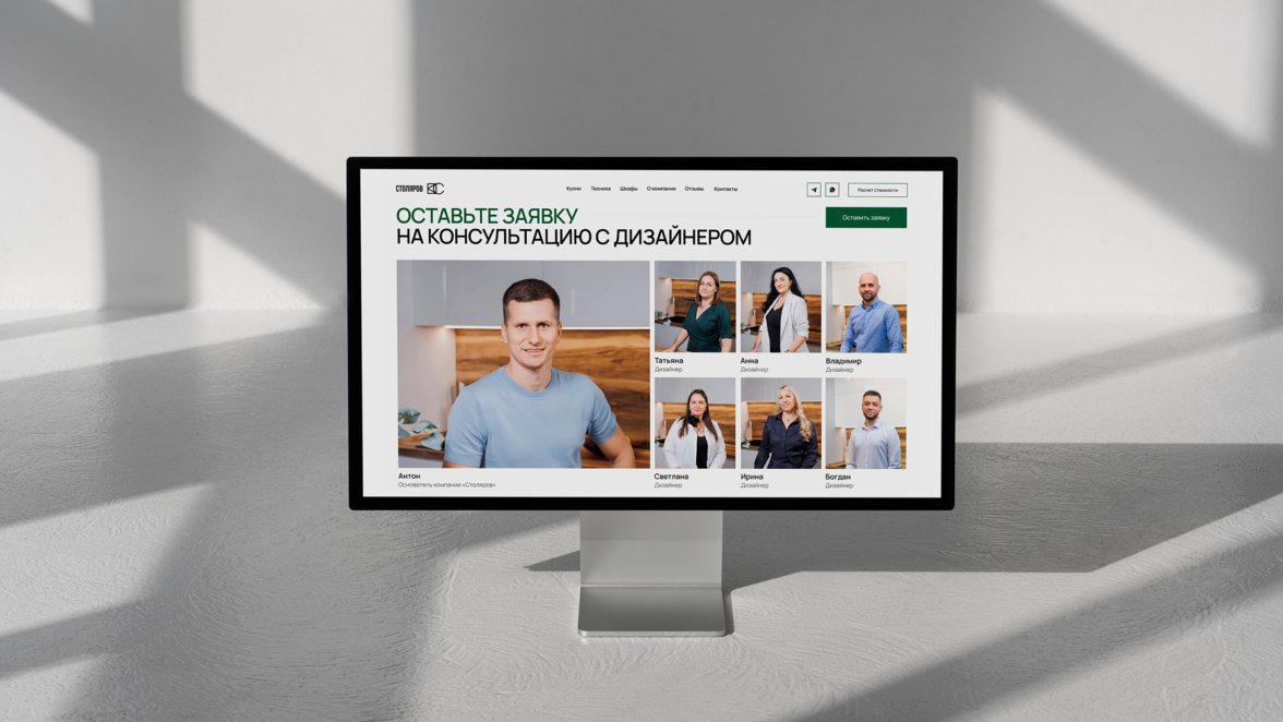 Самым важным моментом было доверие. Мы хотели показать, что за этим бизнесом стоят неравнодушные люди, поэтому уделили особое внимание команде. На главной странице разместили фотографии дизайнеров, чтобы пользователи могли увидеть тех, кто создает их будущий интерьер или ведёт консультации.