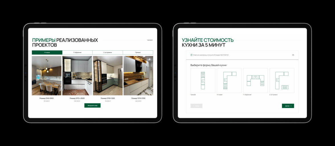 По функционалу задача была чёткой: нужен слайдер на первом экране, каталог с реализованными проектами кухонь, а также квиз и классические формы для сбора заявок.