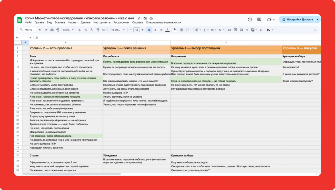Результат: 20% всех оплат пришлось именно на карьерные консультации. Мы не потеряли аудиторию, которая «ещё не готова» — мы предложили им подходящий продукт и помогли клиенту заработать на этом денег. Без глубинного исследования это было бы просто невозможно. А когда у тебя в эксельке горит жирное возражение, ты не можешь его не закрывать 🙂