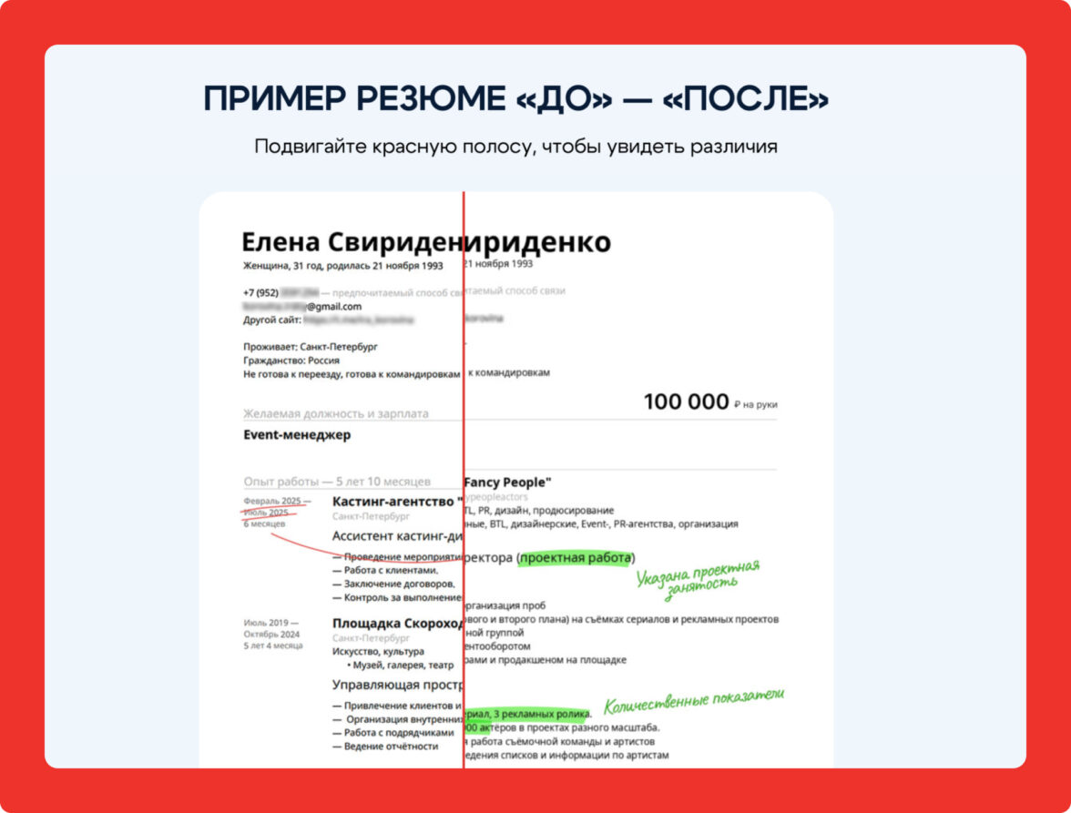 Одна из главных болей: «Не понимаю, как должно выглядеть хорошее резюме». Вместо абстрактных обещаний мы показали конкретный пример трансформации резюме с интерактивным ползунком. На скриншотах — стрелочки и подписи: что именно изменилось и почему это важно.