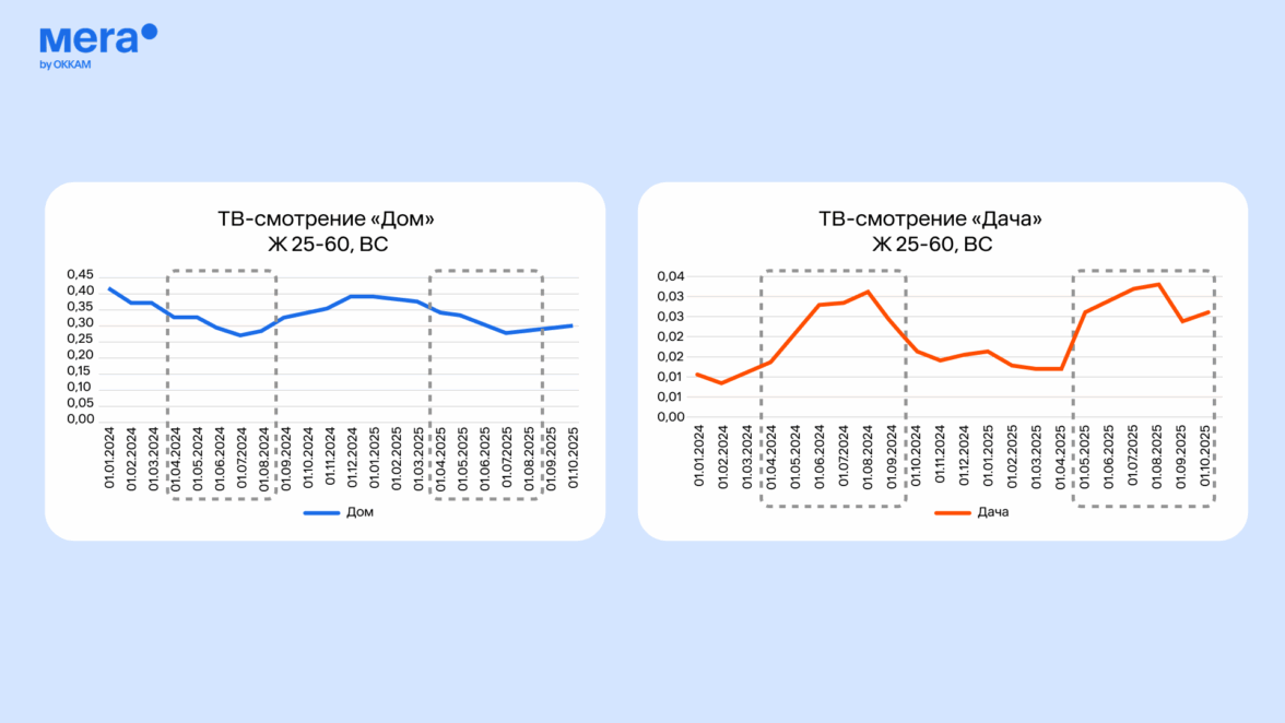 «Лента» традиционно использует классическое телевидение как один из ключевых каналов коммуникации, обеспечивающий стабильные результаты. Однако анализ динамики телесмотрения за 2024–2025 годы показал, что поведение аудитории заметно меняется в зависимости от сезона.