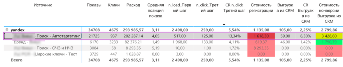 Автотаргетинг запускали на двух настройках — автоматической и ручной. На автомате инструмент работал плохо — приходило мало лидов по высокой цене. На ручной настройке автотаргетинг показал себя лучше, и в итоге мы остановились именно на такой стратегии.